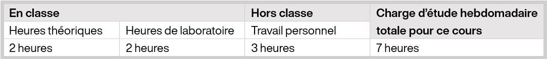 Ce tableau résume la charge de travail hebdomadaire estimée pour ce cours.