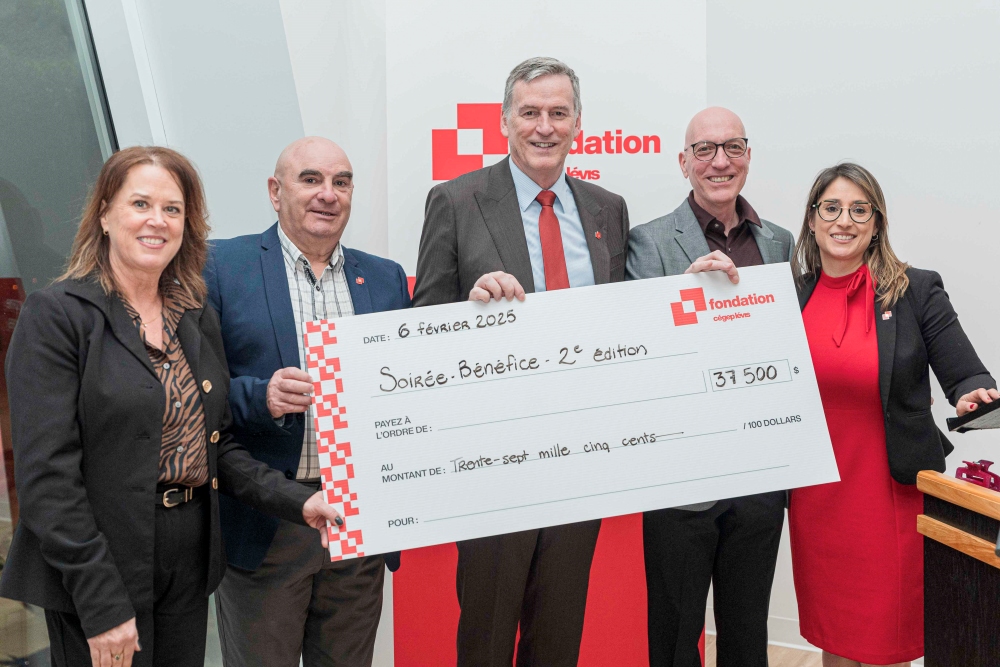 C’est avec fierté que Kathleen Cantin, directrice de la Formation continue et des services aux entreprises, Michel Lessard, Adm. A MBA, trésorier de la Fondation, Guy Patterson, directeur général du cégep et administrateur de la Fondation, Yves Dessureault, président du conseil d’administration de la Fondation, et Claudie Brisson, directrice générale de la Fondation, ont présenté le chèque symbolique au montant de 37 500 $.